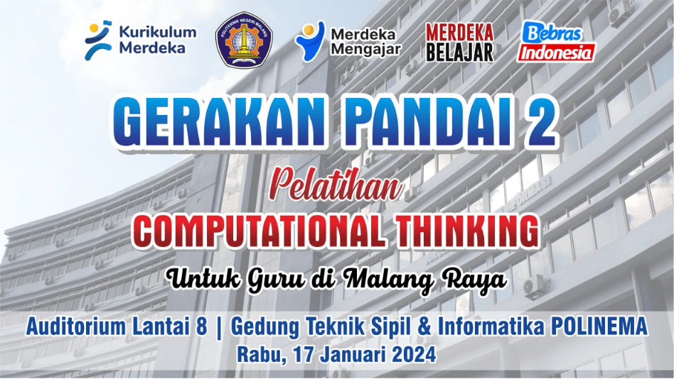 Kegiatan pelatihan bagi para Guru telah dilaksanakan melaluli workshop Menjadi Pengajar Kreatif & Pandai Melalui Computational Thinking dalam Gerakan PANDAI yang bersama kurang lebih 50 guru terdaftar dari Diknas Kota Malang dan Kab. Malang pada bulan Januari & Juni 2024. Pada kegiatan pelatihan bagi Guru SMP, SMA serta Madrasah disampaikan terkait mekanisme dalam melaksanakan proses pembelajaran berbasis Computational Thinking serta berbagai model skema penyampaian materi baik secara luring maupun daring yang salah satunya dengan memanfaatkan sietem pembelajaran e-learning memanfaatkan Learning manajemen system (LMS). Berikut kami lampirkan sebagian materi yang disampaikan pada kegiatan tersebut.